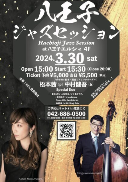 会場:八王子エルシィ 4F Open 15:00 Start 15:30 (Close 20:00) Charge: 予約5,000円 当日5,500円 1フードボックス付き・ドリンク別・ 入れ替えなし ※お支払いは当日現金でお願いします。 ご予約:042-686-0500 (HCL合同会社 受付・平日10:00-18:00) or QR